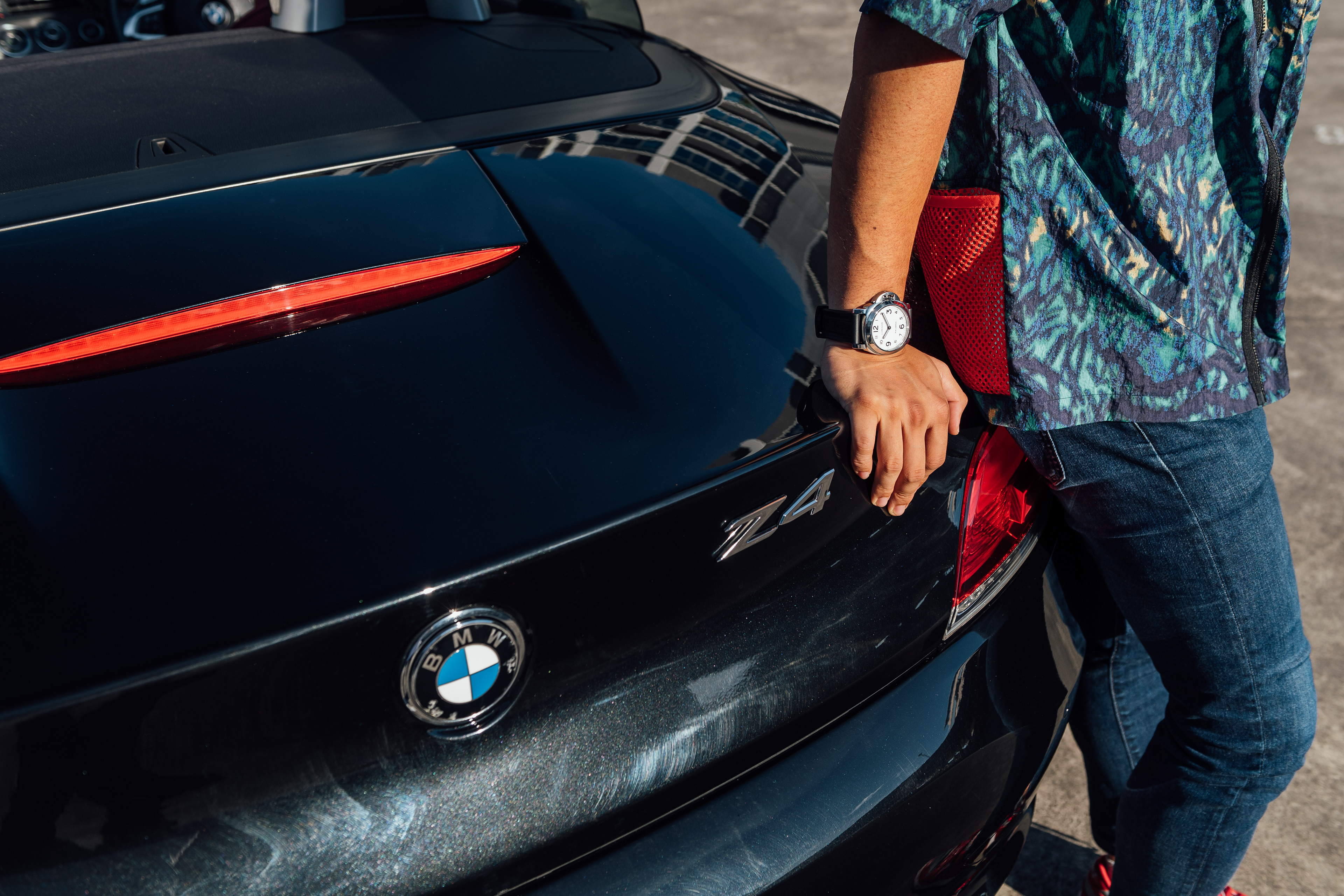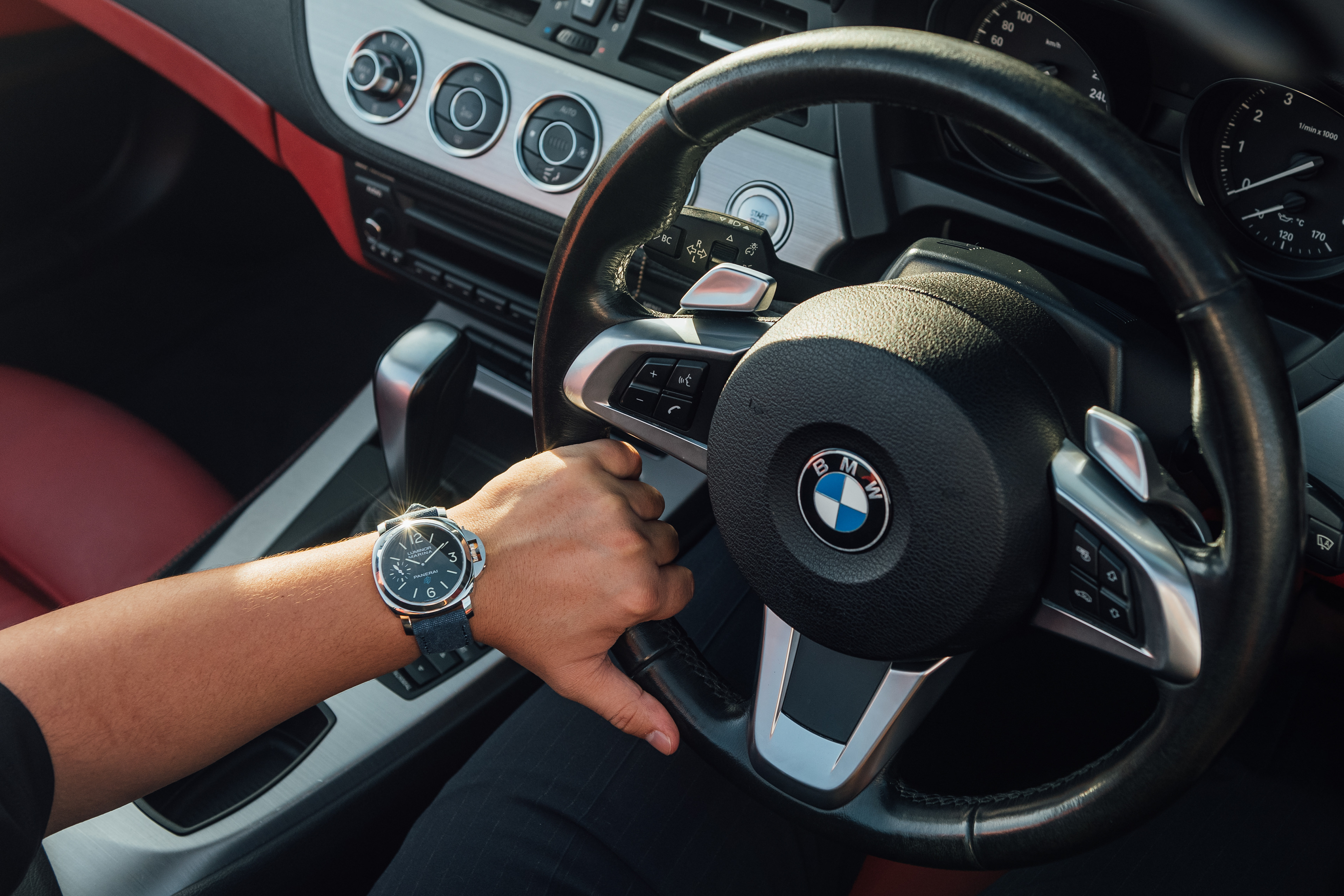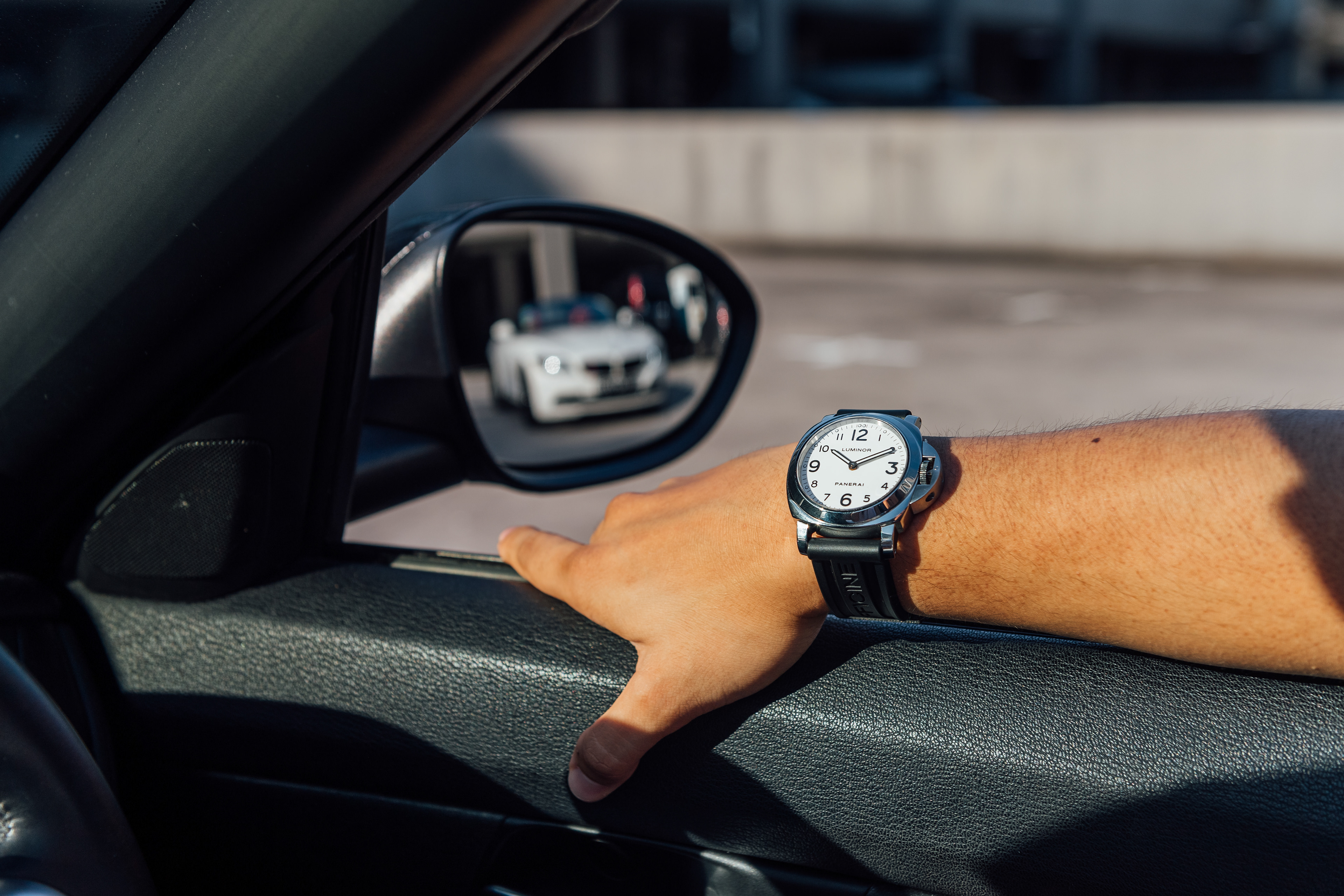 Exclusive promotional content shot for Meyer Motors and TimeTells featuring the Panerai PAM 777 and PAM 114, paired with a black and white BMW Z4.
