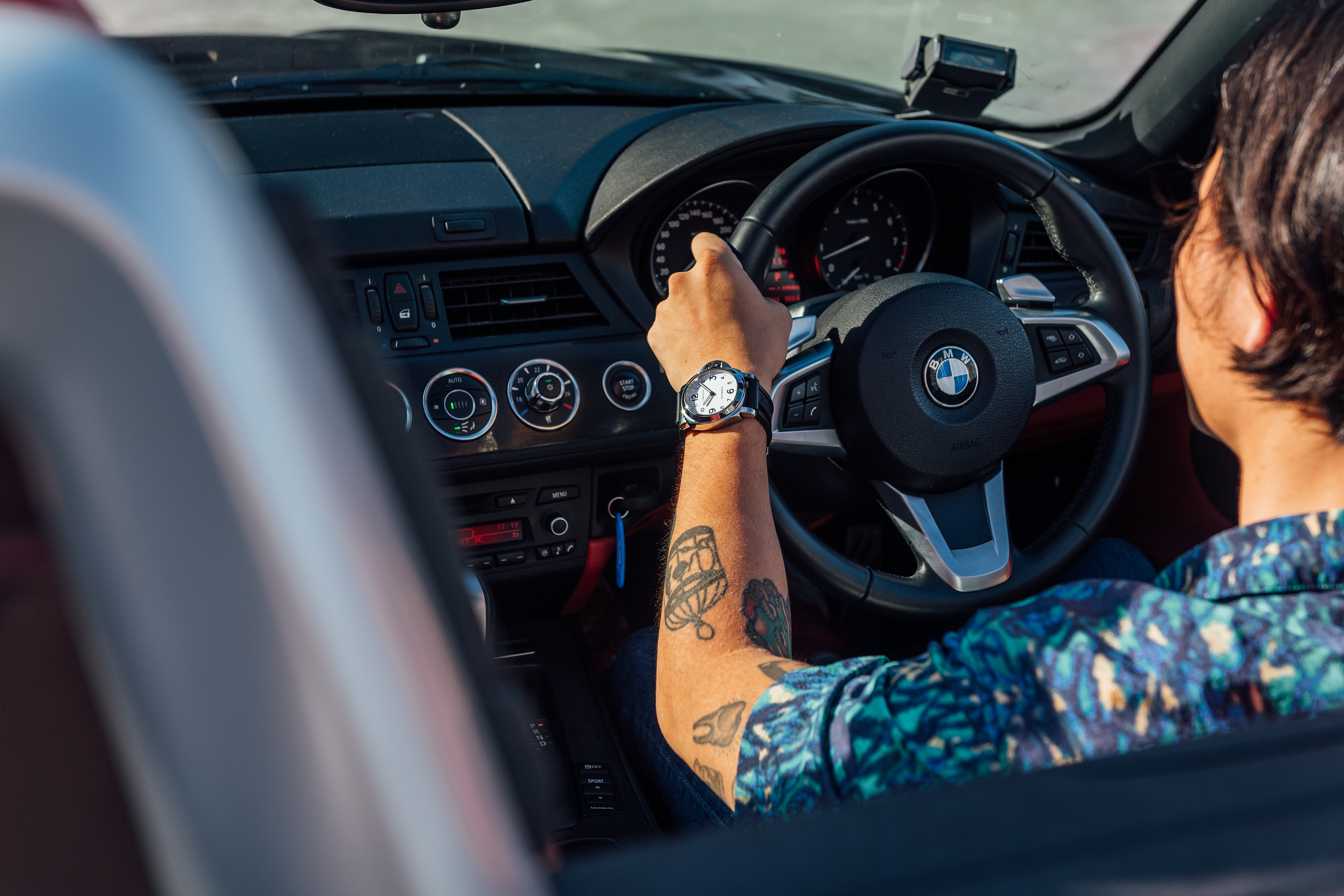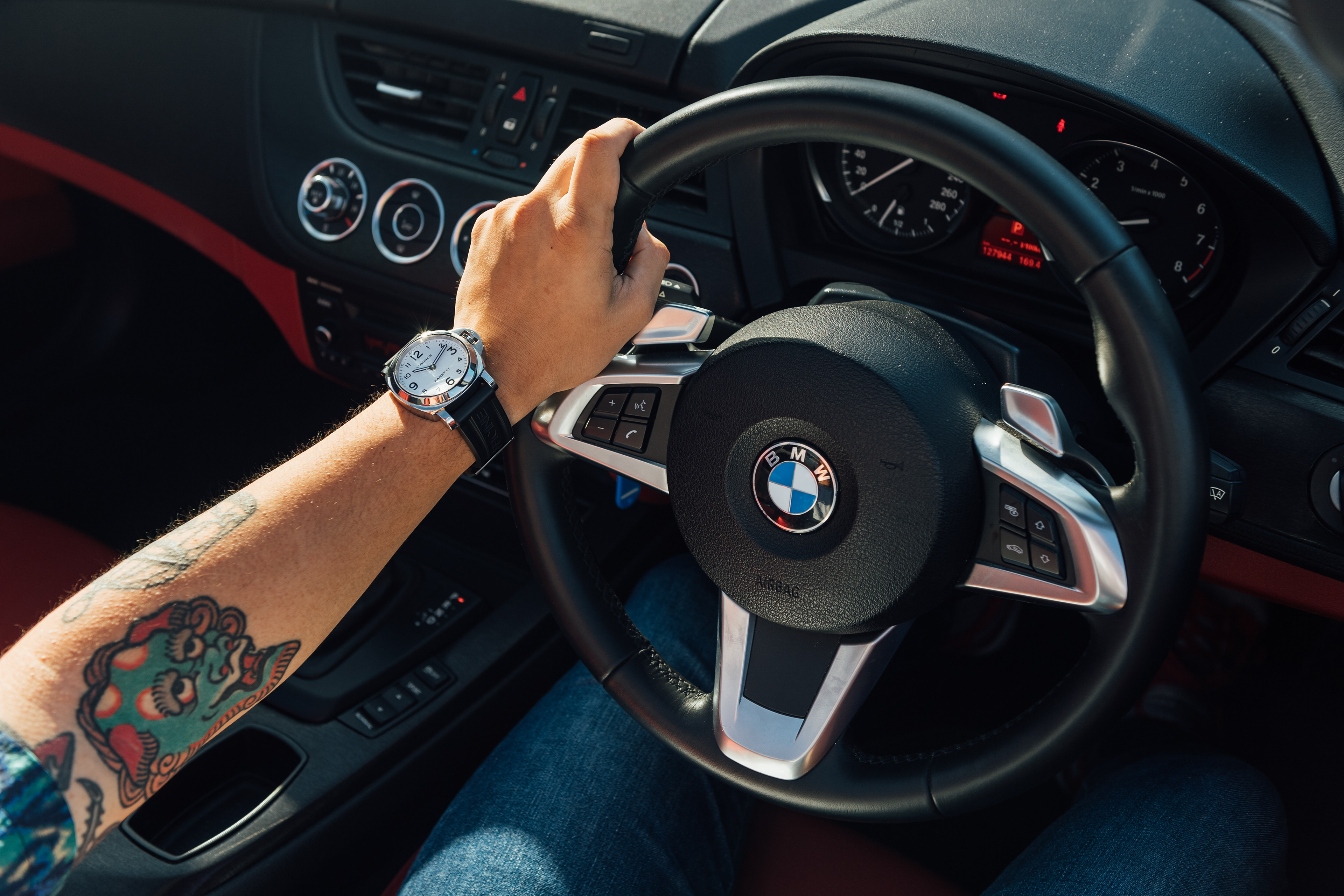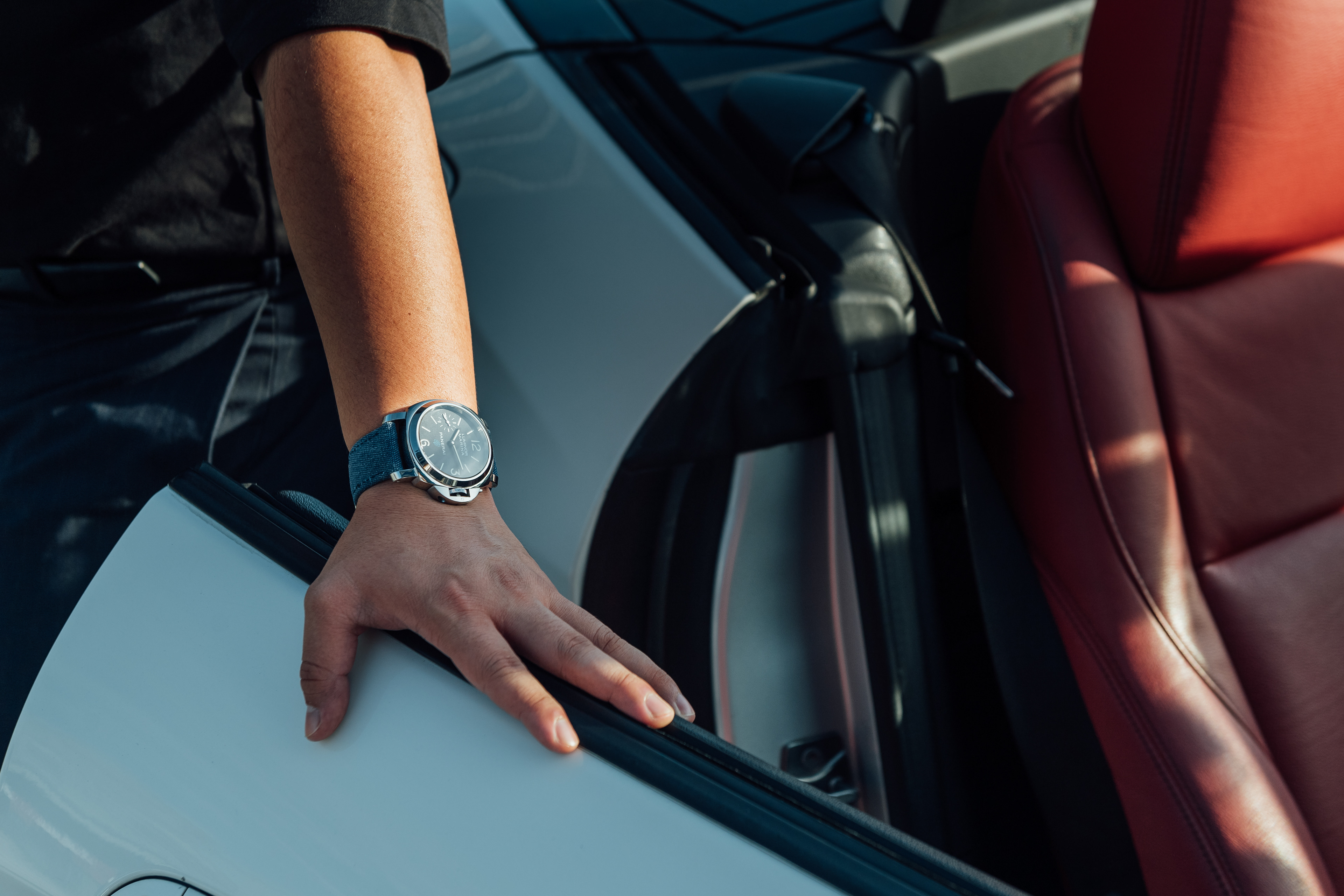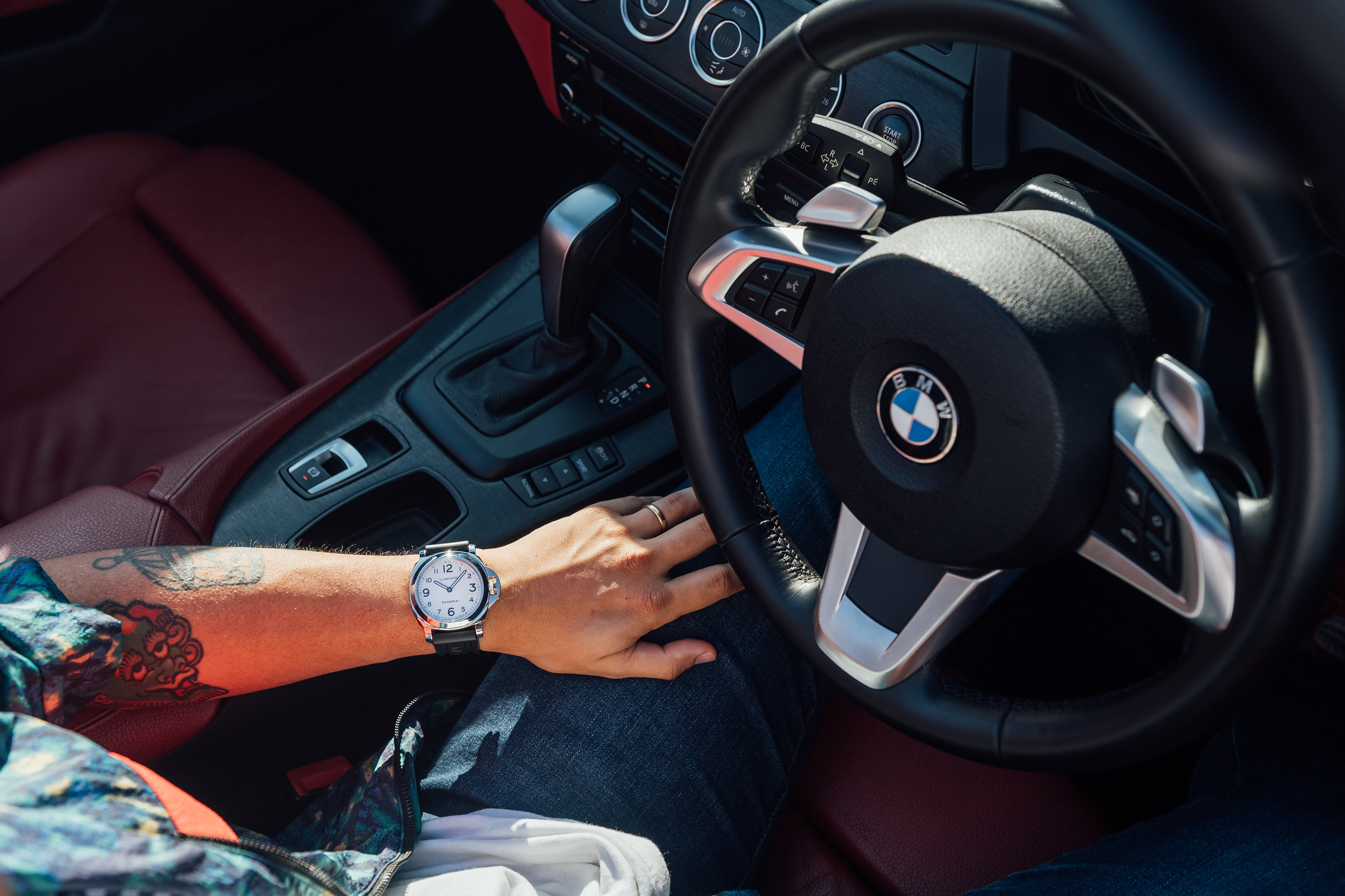 Exclusive promotional content shot for Meyer Motors and TimeTells featuring the Panerai PAM 777 and PAM 114, paired with a black and white BMW Z4.