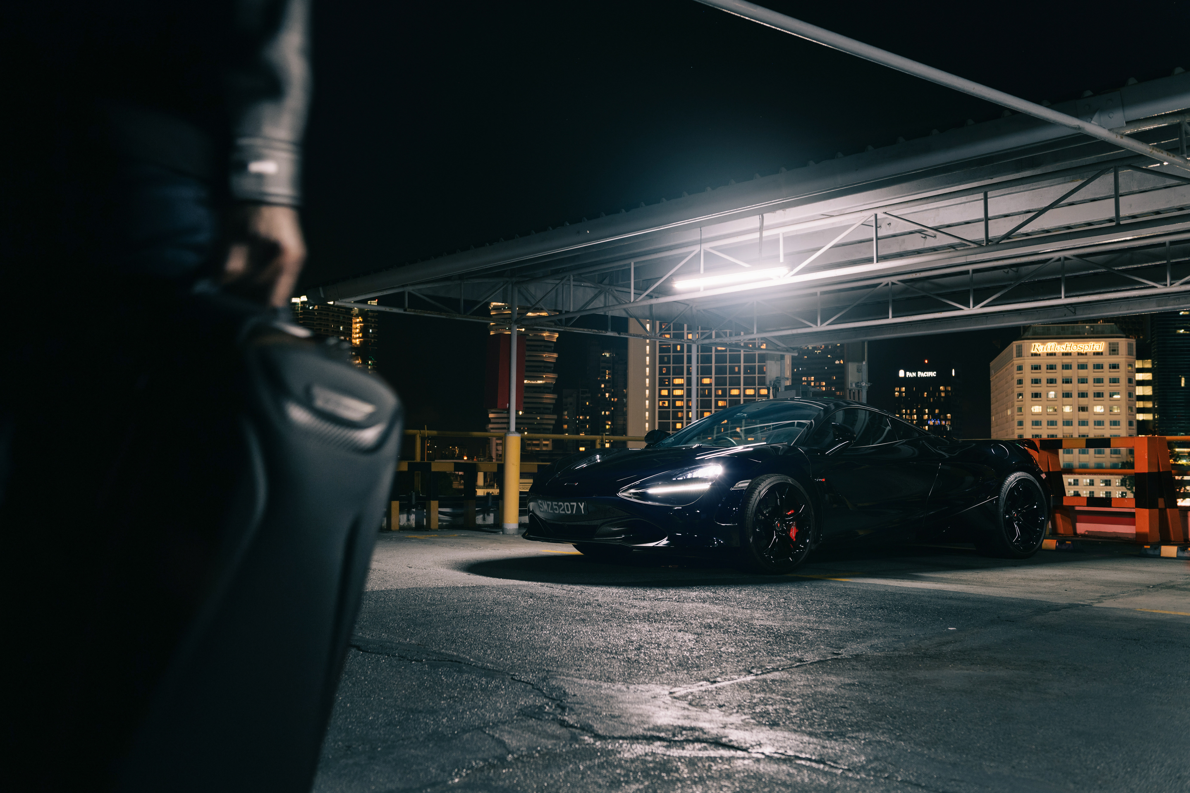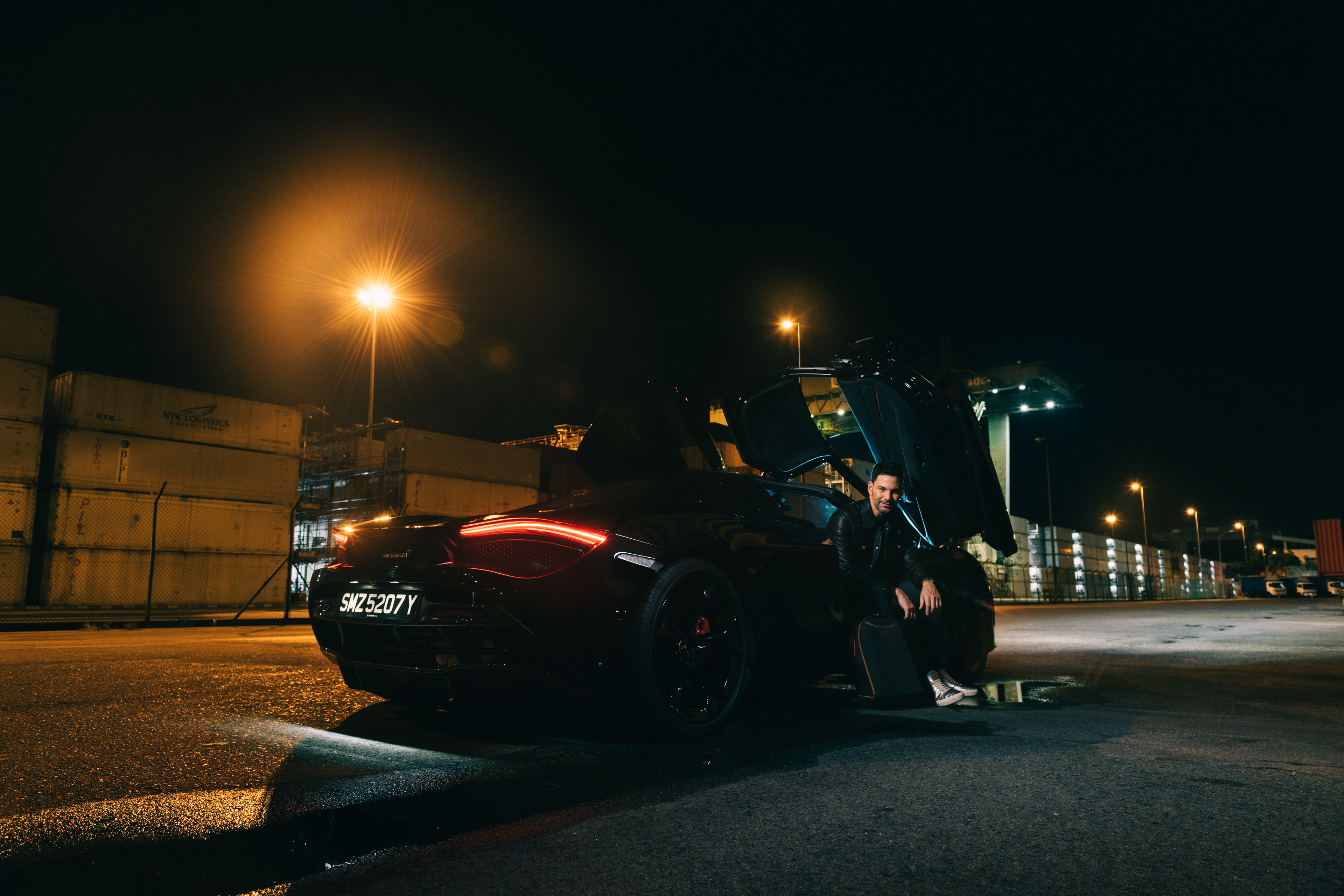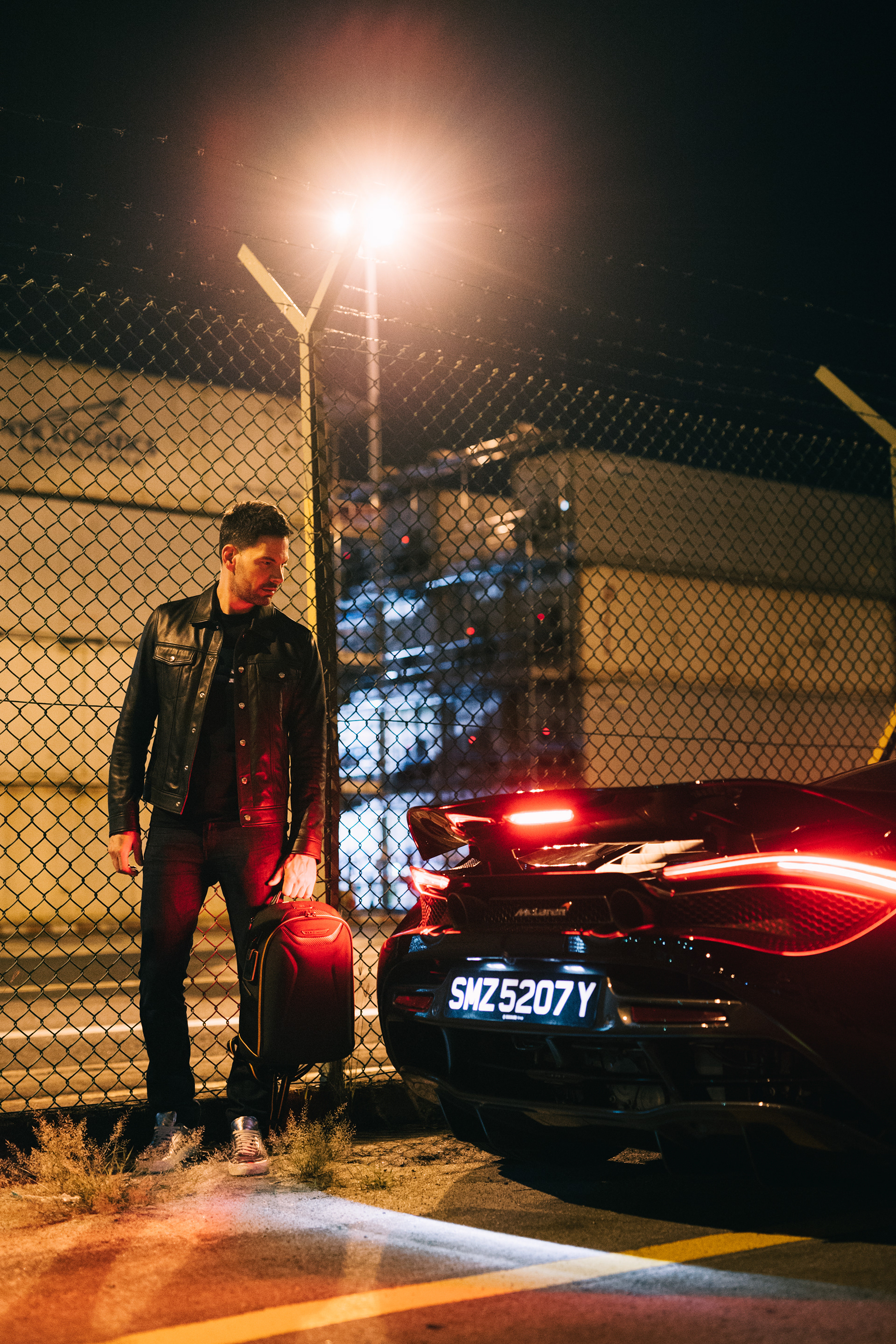 A visual set for the TUMI | McLaren Collection, featuring Bobby Tonelli and the McLaren 720S.
